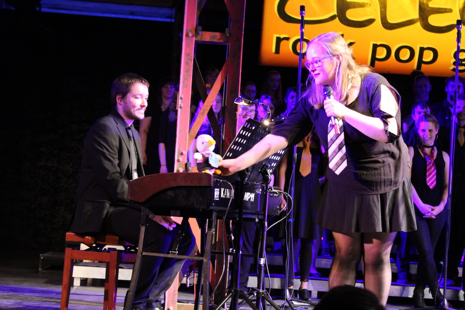 Dann war es soweit. Ich war schrecklich aufgeregt. Mein Platz war ganz vorne auf dem Klavier. Unser Chorleiter Martin gab uns die Töne für „Auf uns“, das Lied, mit dem wir aufgehen sollten. Alle fangen an zu singen, aber … irgendetwas ist anders als sonst. Die Tonart! Egal, alle lächeln und singen voller Überzeugung. Das hat der Chor wirklich gut gemeistert.